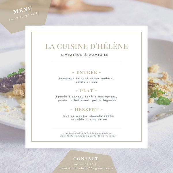 La cuisine d'Hélène vous propose une livraison à domicile et chaque semaine un menu différent. Même pendant le confinement on peut se faire plaisir !